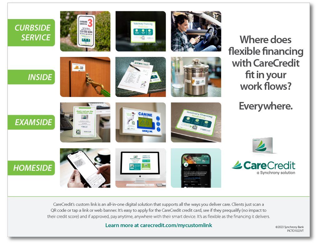 Where does flexible financing with the CareCredit health and pet care credit card fit in your practice? Check out all the places you can share your custom link and QR code.